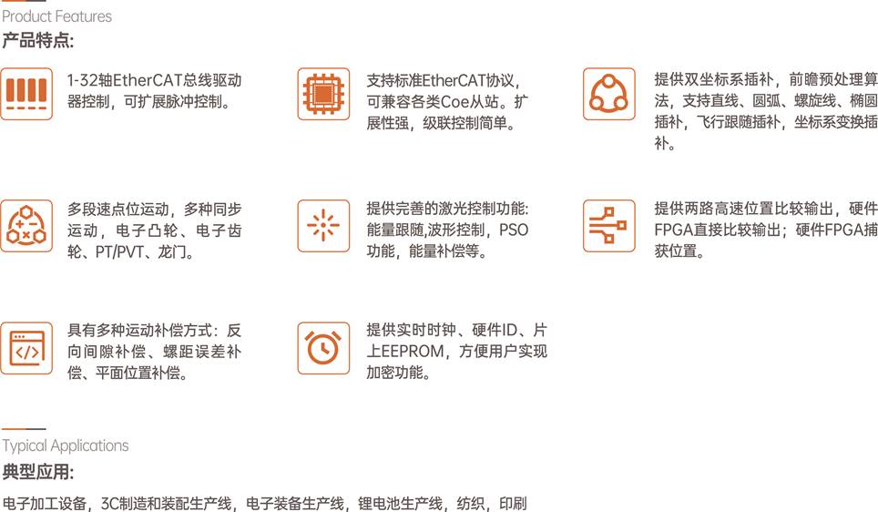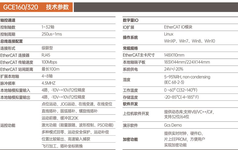 提供完善的運動控制功能:支持任意2軸直線、圓弧、橢圓插補,支持任意3軸空間圓弧插補/空間螺旋線插補、4-8軸直線插補,雙坐標飛行插補,跟隨插補運動等。